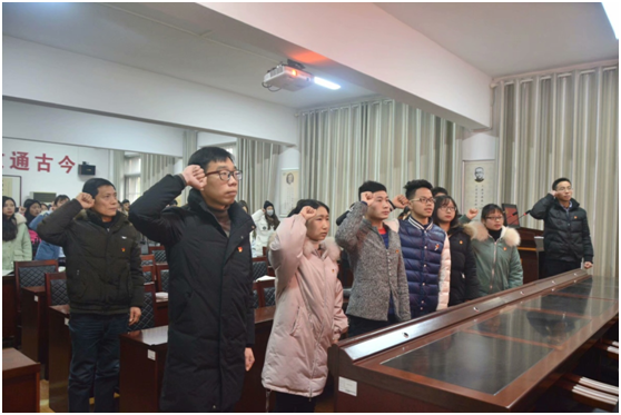 (通讯员 万典 朱佐民/文 朱佐民/摄)1月4日上午9:00,公司在东校区8教406举行了庄严而神圣的接收新党员暨入党宣誓大会。公司党委书记高迎斌、党委副书记袁海山、员工党支部书记严星和兼职辅导员林香亮参与本次大会。全体入党积极分子、发展对象和全体党员同志到会。会议由袁书记主持。