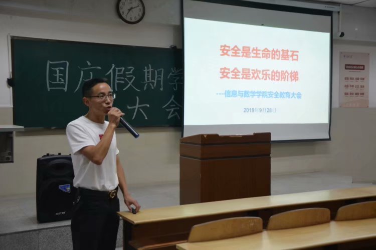 袁海山书记以“安全是生命的基石,安全是快乐的阶梯”为主题,就消防安全、如何防骗、人身安全、如何防盗、交通安全、国家安全六个安全问题展开安全教育。在消防安全方面,袁书记通过列举往年校园消防安全事故,向大家强调要注重消防安全,时刻警惕。在如何防骗方面,袁书记告诫大家要抵制校园贷,谨防传销、电信诈骗。紧接着,他就防溺水、饮酒、抽烟等人身安全与同学们展开交流,并向大家介绍了保护人身安全的相关常识。国庆假期中,宿舍防盗至关重要,袁书记提醒大家要关好门窗,重要物品随身携带,切不要大意。“道路千万条,安全第一条”,国庆期间车多人多,同学们要注重交通安全,乘坐合法交通工具。最后,袁书记向大家特别强调了国家安全,今年是祖国70周年华诞,同学们要高举爱国主义旗帜,不做危害回家、危害民族的事。袁书记在总结讲话中提到,每一位同学都要爱祖国、爱人民、爱劳动,更要爱自己,树立安全防范意识,安全警钟要长鸣。