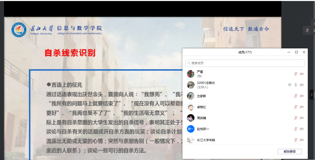 钟老师主要从心理健康重要性、心理危机的识别、员工骨干如何干预、公司心理健康中心这四方面展开。钟老师老师重点讲解了各位班委如何识别心理危机。通过平时行为的转变、言语的异常、身体的异常、心理的异常等这些危险信号等去识别同学的心理状态,特别在心理危机高发的时间段通过事件如何有效识别心理危机。钟老师在讲解怎样有效干预时,他重点讲解了如何去帮助心理危机员工以及需要注意避免的雷区,并且为同学们讲解了公司心理干预网络体系。讲座尾声,钟老师老师详细介绍了公司心理健康中心的团队及设施,遇到问题时如何求助