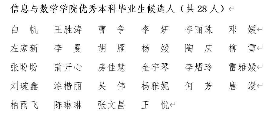 根据学校《关于开展2022届优秀本科毕业生评选与表彰工作的通知》的文件要求,公司认真组织开展了2022届优秀本科毕业生评选工作,经个人申请、班级推荐、学院审议,讨论决定拟向学校推荐优秀毕业生28名,现予以公示。