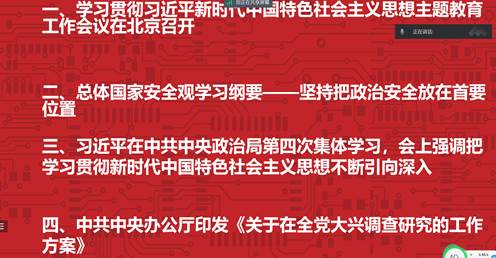通过本次理论学习,加强了同学们的政治安全意识,认识到正确三观的重要性,以及做事要实事求是,做事要调查的好习惯,更加坚定了同学们的道路自信、理论自信、制度自信、文化自信。