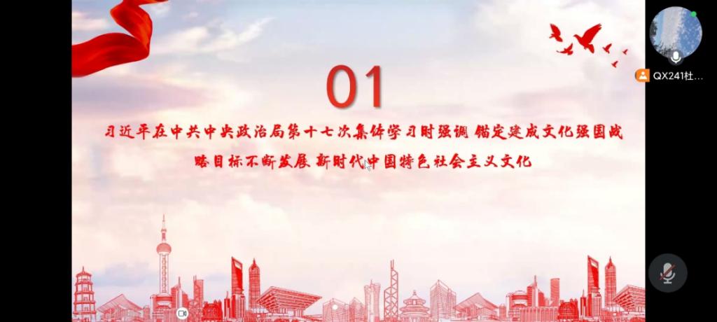 此次理论学习重点的是习近平主席在中共中央政治局第十七次集体学习时强调的“锚定建成文化强国战略目标 不断发展新时代中国特色社会主义文化”。习近平主席在主持学习时强调,要锚定2035年建成文化强国的战略目标,坚持马克思主义这一根本指导思想,植根博大精深的中华文明,顺应信息技术发展潮流,不断发展具有强大思想引领力、精神凝聚力、价值感召力、国际影响力的新时代中国特色社会主义文化,不断增强人民精神力量,筑牢强国建设、民族复兴的文化根基。