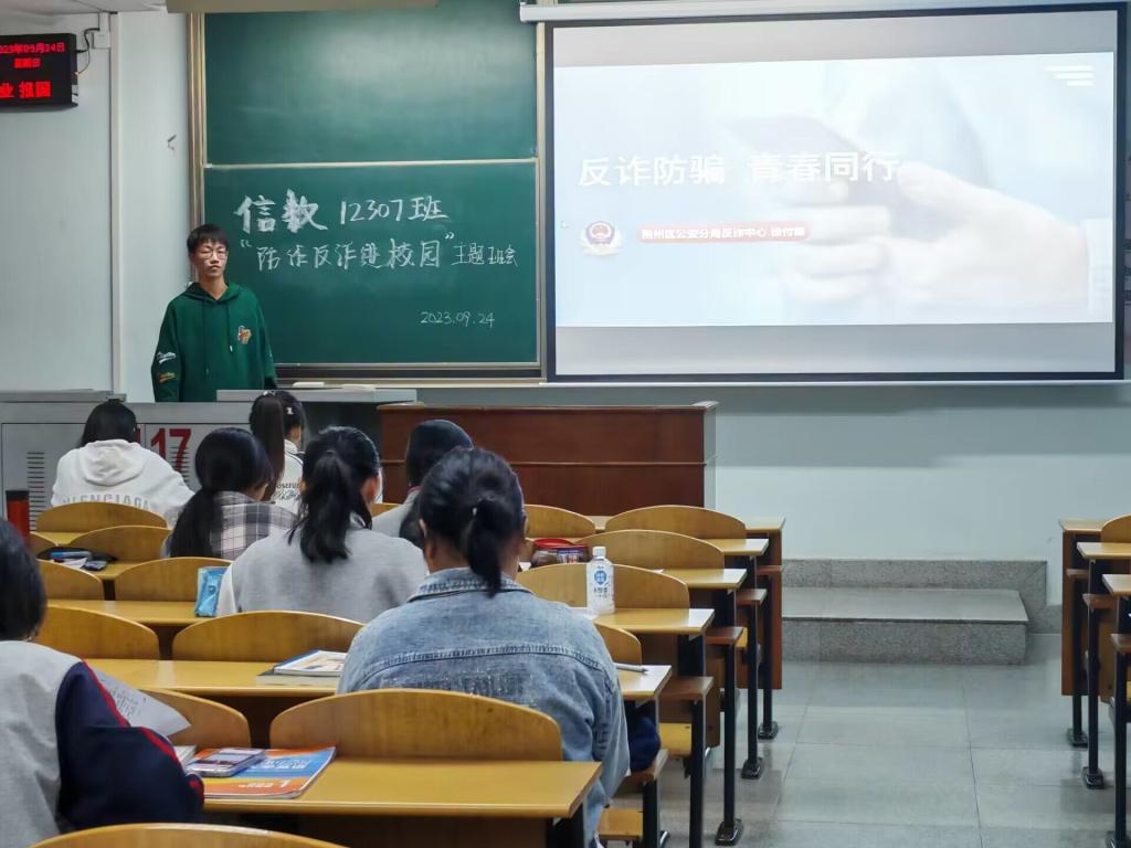 在班会上,班长结合常见典型诈骗案件,揭露各类电信诈骗犯罪活动的新变化,新特点,提醒班级同学在网上观看视频,购物,交友时要提高防范意识,谨防上当受骗,同时班主任对常见的网络兼职刷单诈骗,网络游戏产品虚假交易诈骗,“杀猪盘”诈骗等诈骗方式进行了详细的讲解,并通过鲜活的案例,让同学们意识到电信诈骗,离我们并不远。随后班长就如何识别防范电信诈骗这一方面进行了详细的说明,并教授了同学们“防电信诈骗十守则”与“预防电信诈骗五不要”,通过顺口溜的形式,让同学们更加接受这些预防守则,最后班主任提醒同学们在日常生活中要保护好个人隐私,不要随便泄露网络账户,银行卡等信息,避免给诈骗犯罪分子可乘之机,同时叮嘱同学们及时下载“国家反诈中心”APP,进一步筑牢反诈骗“防火墙”,全面做到防诈反诈进校园。