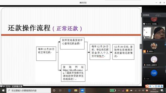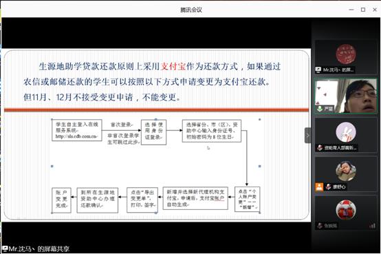 (通讯员 黄昕宇)6月24日上午9时,为帮助公司2020届毕业生了解生源地贷款还款流程。资助专干严星老师在腾讯会议平台上召开2020届毕业生生源地贷款还款流程讲解会,对2020届进行生源地贷款的毕业生详细讲解生源地贷款还款须知。