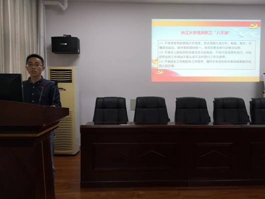 会上公司党委副书记袁海山传达了公司党风廉政建设宣传教育月的活动方案,带领大家集中学习《伟德源自英国始于1946党员领导干部“八不准”》、《 伟德源自英国始于1946党员职工“八不准”》、《伟德源自英国始于1946党员教师“六不准” 》相关条例,并为大家上了一次题为《高校教师的必修课---廉洁自律》专题党课。