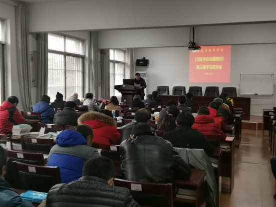为深入学习《习近平谈治国理政》第三卷,用习近平新时代中国特色社会主义思想武装头脑、指导实践、推动工作,信数学院于12月3日下午在8教406举行了《习近平谈治国理政》第三卷学习宣讲会。校宣讲团成员、法学院副教授胡承武受邀主讲,公司党委书记高迎斌主持,全院教职工参加。