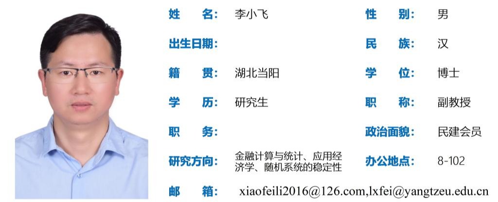 李小飞,男,博士研究生,博士后,副教授,硕士研究生导师。现为中国商业统计学会理事,荆州市政协委员,荆州市人民政府督学,湖北省科技厅、江西省科技厅、深圳市发改委科技评审专家,美国《数学评论》、德国《数学文摘》评论员。主要研究方向为金融计算与统计、应用经济学、随机系统的稳定性;主持省部级科研项目2项,主持省部级教研项目3项和校级教研项目3项,主持政府委托项目6项;发表学术论文40余篇,其中被SCI检索21篇,EI检索5篇,CSSCI检索2篇;出版教材3部;先后荣获“优秀研究生导师”、”优秀市政协委员“、“教育部优秀访问学者”、”博士后创新成果奖”等荣誉称号。