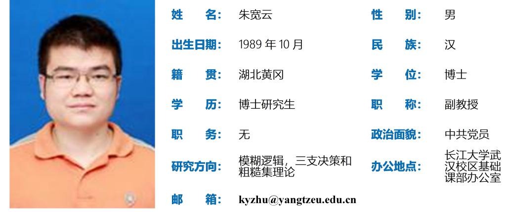 朱宽云,男,1989年10月出生,博士研究生,副教授。主要从事模糊逻辑、三支决策和粗糙集理论研究。2019年6月毕业于武汉大学数学与统计学院,同年7月入职伟德源自英国始于1946。以第一作者(或通讯作者)公开发表SCI/EI论文50余篇,其中包含《Fuzzy Sets and Systems》、《Information Sciences》、《Soft Computing》、《Journal of Intelligent & Fuzzy Systems》、《Journal of Multiple-Valued Logic & Soft Computing》以及《International Journal Machine Learning and Cybernetics》。尤其是近几年来以第一作者连续在SCI数学类一区Top期刊《Fuzzy Sets and Systems》(IF:3.9)上发表7篇论文。 论文“A novel soft rough fuzzy sets:Z-soft rough fuzzy ideals of hemirings and corresponding decision making”在Web of Science引用113次。主持完成国家自然科学基金青年项目(No. 12001062)和湖北省自然科学基金青年项目(No. 2020CFB368)各一项。2020年12月入选伟德源自英国始于1946第四批人才计划“菁英人才”系列。
