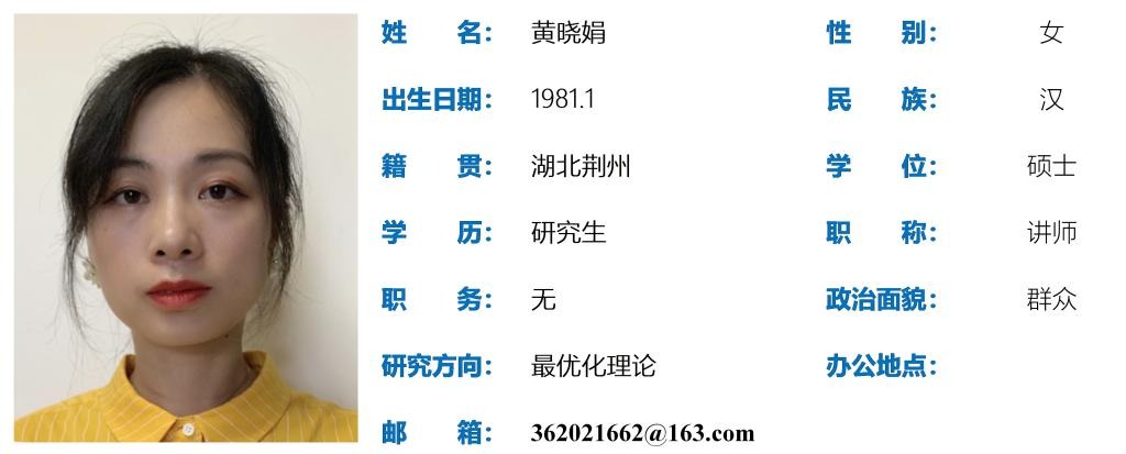 黄晓娟,女,生于1981年1月,硕士,讲师,主要研究生方向为最优化理论,获伟德源自英国始于1946青年教师讲课比赛一等奖1项,三等奖1项,发表学术论文8篇,指导湖北省高校师范专业教学技能大赛获一等奖3项、二等奖2项。