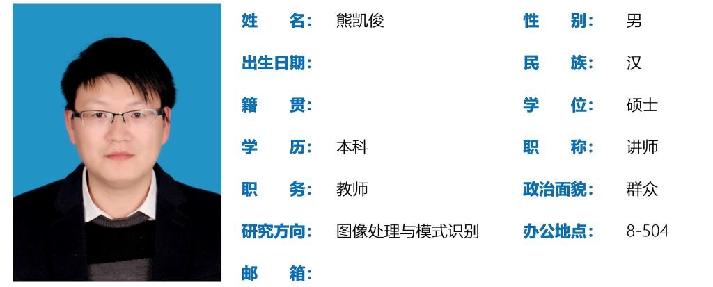 熊凯俊 男 讲师 硕士,本科毕业于中国地质大学(武汉)数学与应用数学专业,主要研究控制科学与工程中的图像处理与模式识别。在科研方面,发表论文多篇,参与国家自然科学基金二项,参与国家发明专利两项。教学方面,曾获院系教学比赛奖项,发表教研论文多篇。